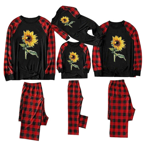 Family Christmas pjs matching sets, bright sunflower printed long sleeve tshirt tops and red plaid pants, perfect for Christmas family gathering.