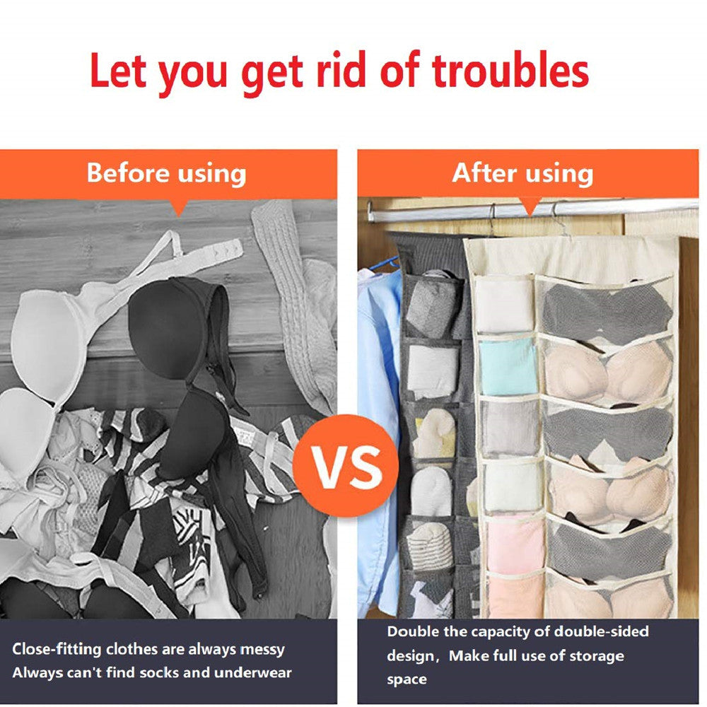 Durable double sided closet hanging organizer, Breathable mesh premium oxford fabric design helps you quickly identify stuff through clear pockets, saving you time from blind searching.