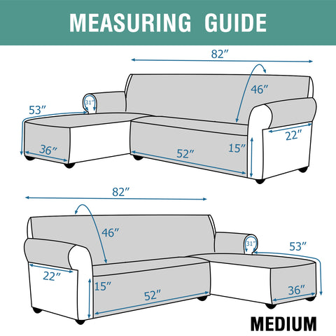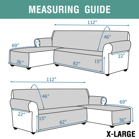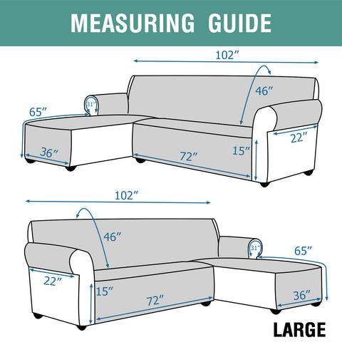There are three sizes of l couch cover available that will fit most family L shape sofas. Please refer to the dimension drawing on the page for specific dimension measurement guidelines.