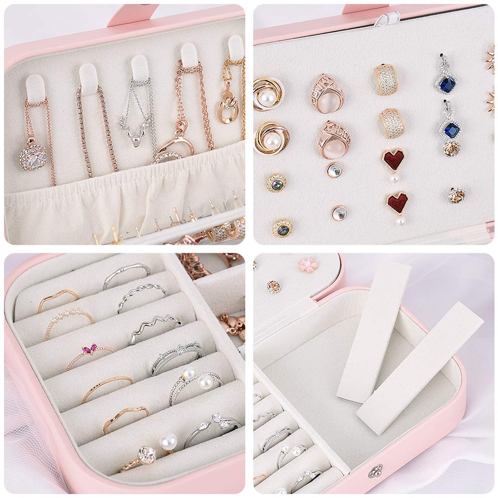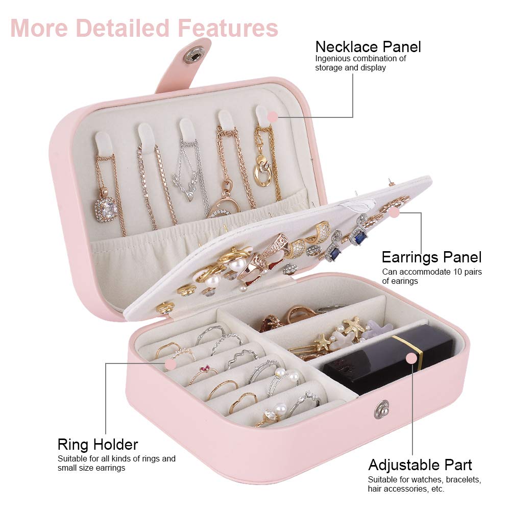 There is necklace panel with 5 snaps to hang necklaces, one earing panel for your different size earrings, ring holder is suitable for almost 10 pairs of rings and adjustable part for other size valuble things like wathces, bracelets and so on, make your jewelry well organized and easily access.
